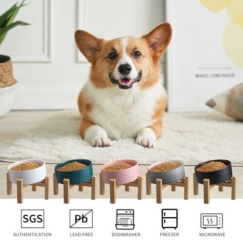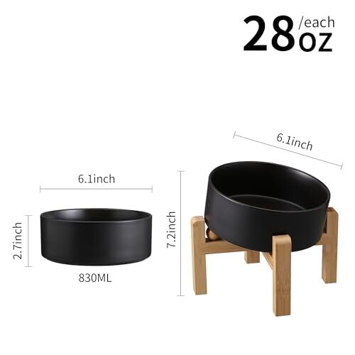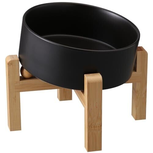 The product is an elevated/raised ceramic dog and cat bowl with a 15-degree tilted angle to reduce neck strain during feeding. Capacity is 3.6 cups (850 ml, 29 fl oz). The bowl is designed with a bamboo wood stand and a non-slip base. Materials include 100% porcelain ceramic, which is lead- and cadmium-free, high-temperature resistant, non-toxic, and odor-free. The item is microwave safe and dishwasher-safe for easy cleaning. Suitable for small to medium breeds for serving dry food, wet food, snacks, and water.