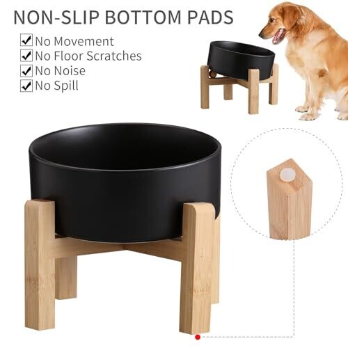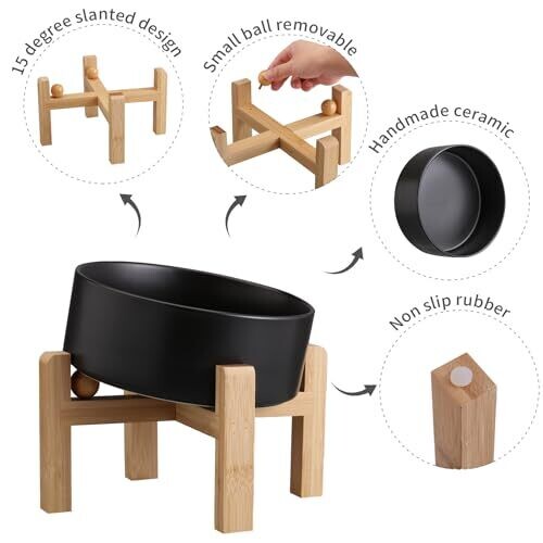 Elevated bowl with a 15° tilt for comfortable feeding and reduced neck strain. Features a non-slip stand with a sleek bamboo base, center-focused ceramic surface, easy to clean, microwave safe, and dishwasher-friendly for dry or wet food and water.