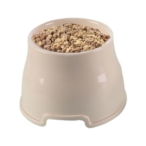 Elevated bowl with greater height and depth than standard bowls to support pet posture and swallowing.